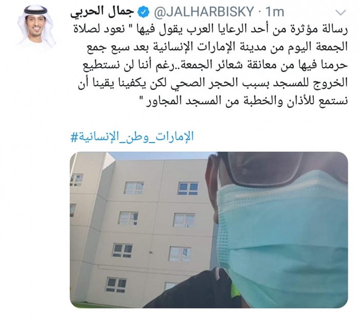 وكتب الحربي، في تغريدة له عبر موقع التواصل الاجتماعي تويتر، تابعها المشهد العربي: "رسالة مؤثرة من أحد الرعايا العرب يقول فيها: نعود لصلاة الجمعة اليوم من مدينة الإمارات الإنسانية بعد سبع جمع حرمنا فيها من معانقة شعائر الجمعة..رغم أننا لن نستطيع الخروج للمسجد بسبب الحجر الصحي لكن يكفينا يقينا أن نستمع للأذان والخطبة من المسجد المجاور".
