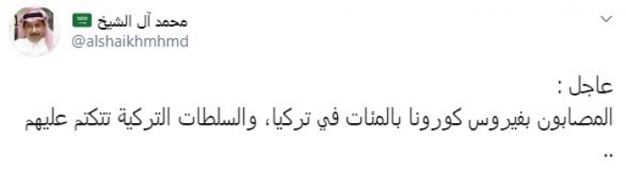 أعلن الكاتب الصحفي السعودي محمد آل الشيخ، اليوم، عن تفشي فيروس كورونا في تركيا، مؤكدًا أن المصابون بالفيروس بالمئات في أنقرة، والسلطات التركية تتكتم عليهم.