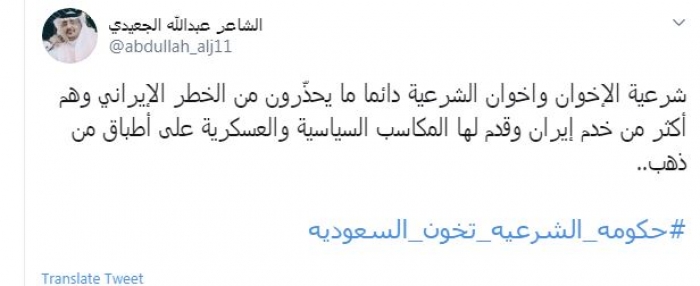 وقال في تغريدة عبر "تويتر" رصدها "المشهد العربي": "شرعية الإخوان وإخوان الشرعية دائماً ما يحذّرون من الخطر الإيراني وهم أكثر من خدم إيران وقدم لها المكاسب السياسية والعسكرية على أطباق من ذهب".