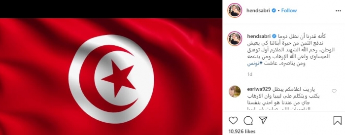 ونشرت الفنانة هند صبري صورة لعلم تونس، عبر حسابها بموقع "إنستجرام"، وعلقت: " كأنه قدرنا أن نظل دوما ندفع الثمن من خيرة أبنائنا كي يعيش الوطن، رحم الله الشهيد الملازم أول توفيق الميساوي، ولعن الله الإرهاب ومن يدعمه ومن يناصره.، عاشت تونس".