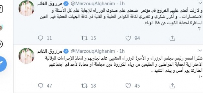 وأضاف: "ولازلت أتمنى عليهم الخروج في مؤتمر صحفي على مستوى الوزراء للإجابة على كل الأسئلة والاستفسارات .. وأكرر شكري و تقديري لكافة الكوادر الطبية والفنية في كافة الجهات المعنية فهم العين الساهرة لحماية الكويت من هذا الوباء".