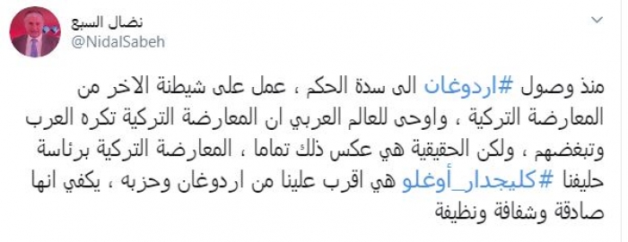 وكتب في تغريدة عبر "تويتر" رصدها "المشهد العربي": "منذ وصول أردوغان إلى سدة الحكم، عمل على شيطنة الآخر من المعارضة التركية، وأوحى للعالم العربي أن المعارضة التركية تكره العرب وتبغضهم، ولكن الحقيقية هي عكس ذلك تمامًا، المعارضة التركية برئاسة حليفنا كليجدار أوغلو هي أقرب علينا من أردوغان وحزبه، يكفي أنها صادقة وشفافة ونظيفة".