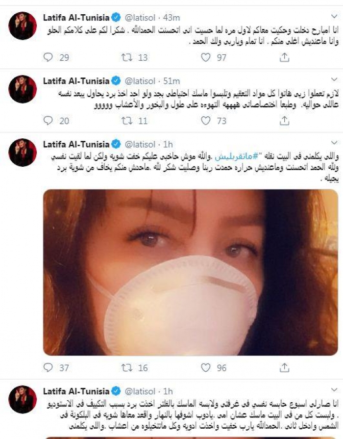 وكتبت لطيفة: "أنا صارلى أسبوع حابسة نفسي فى غرفتى ولابسة الماسك بالفلتر، أخدت برد بسبب التكييف فى الاستوديو، ولبست كل ما فى البيت ماسك عشان أمي يا دوب أشوفها بالنهار، وأقعد معاها شوية فى البلكونة فى الشمس وأدخل ثانى.. الحمد لله يا رب خفيت وأخدت أدوية وكل ماتتخيلوه من أعشاب".