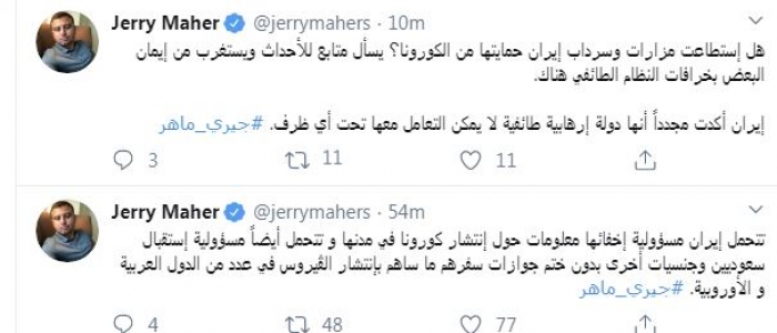 وكتب في تغريدات عبر "تويتر" رصدها "المشهد العربي": "تتحمل إيران مسؤولية إخفائها معلومات حول انتشار كورونا في مدنها و تتحمل أيضاً مسؤولية إستقبال سعوديين وجنسيات أخرى بدون ختم جوازات سفرهم ما ساهم بإنتشار الڤيروس في عدد من الدول العربية و الأوروبية".