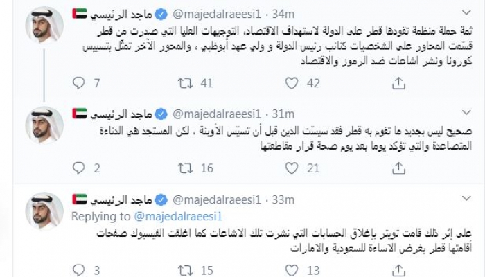 وقال في تغريدات عبر "تويتر" رصدها "المشهد العربي": "ثمة حملة منظمة تقودها قطر على الدولة لاستهداف الاقتصاد، التوجيهات العليا التي صدرت من قطر قسّمت المحاور على الشخصيات كنائب رئيس الدولة وولي عهد أبوظبي، والمحور الآخر تمثّل بتسييس كورونا ونشر إشاعات ضد الرموز والاقتصاد".