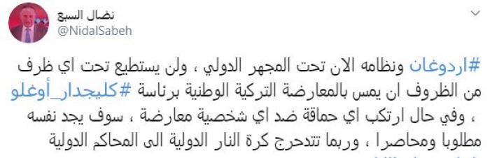 وكتب في تغريدة عبر "تويتر" رصدها "المشهد العربي": "أردوغان ونظامه الآن تحت المجهر الدولي، ولن يستطيع تحت أي ظرف من الظروف أن يمس بالمعارضة التركية الوطنية برئاسة كليجدار أوغلو، وفي حال ارتكب أي حماقة ضد أي شخصية معارضة، سوف يجد نفسه مطلوباً ومحاصرًا، وربما تتدحرج كرة النار الدولية إلى المحاكم الدولية".