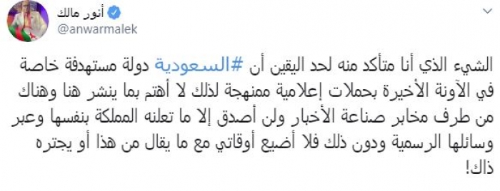 أنور مالك: السعودية دولة مستهدفة بحملات ممنهجة