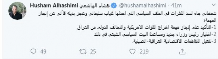 وأضاف: "التأكيد على انجاز مهمة إخراج القوات الأمريكية والتحالف الدولي من العراق اختيار رئيس وزراء جديد ومساعدة البيت السياسي الشيعي في ذلك. تفعيل التفاهمات الاقتصادية العراقية-الصينية".