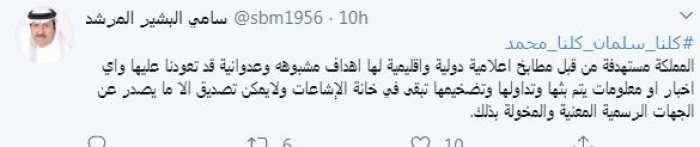 وكتب في تغريدة عبر "تويتر" رصدها "المشهد العربي": "المملكة مستهدفة من قبل مطابخ إعلامية دولية وإقليمية لها أهداف مشبوهة وعدوانية قد تعودنا عليها وأي أخبار أو معلومات يتم بثها وتداولها وتضخيمها تبقى في خانة الإشاعات ولا يمكن تصديق إلا ما يصدر عن الجهات الرسمية المعنية والمخولة بذلك".
