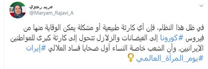 وكتب في تغريدة عبر "تويتر" رصدها "المشهد العربي": "في ظل هذا النظام، فإن أي كارثة طبيعية أو مشكلة يمكن الوقاية منها من فيروس كورونا إلى الفيضانات والزلازل تتحول إلى كارثة كبرى للمواطنين الإيرانيين. وأن الشعب خاصة النساء أول ضحايا فساد الملالي".