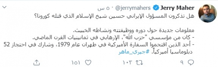 وكتب ماهر عبر تغريدة له عبر "تويتر":"هل تذكرون المسؤول الإيراني حسين شيخ الإسلام الذي قتله كورونا؟معلومات جديدة حول دوره ووظيفته ونشاطه الخبيث".