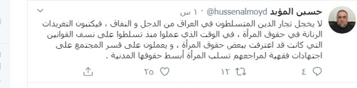 وكتب المؤيد عبر تغريدة له على "تويتر" رصدها "المشهد العربي":"لا يخجل تجار الدين المتسلطون في العراق من الدجل و النفاق ، فيكتبون التغريدات الرنانة في حقوق المرأة ، في الوقت الذي عملوا منذ تسلطوا على نسف القوانين التي كانت قد اعترفت ببعض حقوق المرأة ".