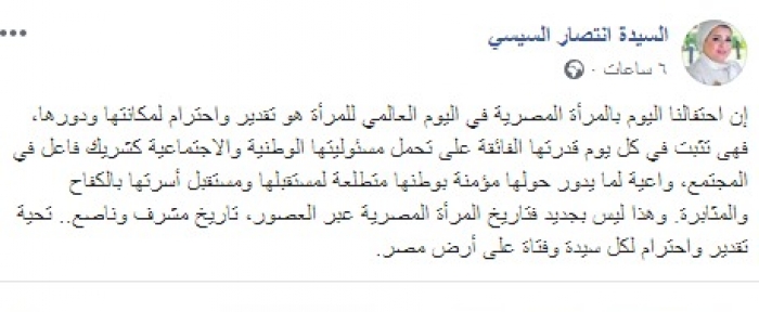 هنأت انتصار السيسي، زوجة الرئيس المصري عبد الفتاح السيسي، نساء مصر، بمناسبة اليوم العالمي للمرأة والذي يتوافق الثامن من مارس من كل عام.