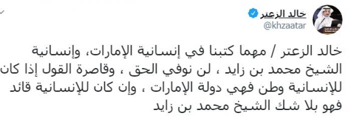 وكتب الزعتر عبر تغريدة له على "تويتر" رصدها "المشهد العربي":" مهما كتبنا في إنسانية الإمارات، وإنسانية الشيخ محمد بن زايد ، لن نوفي الحق".