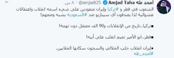 وكتب طه عبر تغريدة له على "تويتر" رصدها "المشهد العربي":"الشعوب في قطر و تركيا وإيران متعودين على شيء اسمه انقلاب واعتقالات عشوائية لذا يصدقون أي سيناريو ضد السعودية يشبه وضعهم".