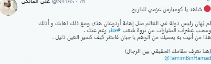 وأضاف: "هذا من أتيت به يحميك من الوهم يا جبان فانظر كيف كسير العين ذليل . (هنا تعرف مقامك الحقيقي بين الرجال) يا تميم بن حمد".
