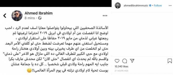 وكتب إبراهيم: "الأساتذة الصحفيين اللي بيحاولوا يتواصلوا معايا، أسف لعدم الرد، أحب أوضح أنا انفصلت عن أم أولادي في أبريل 2019 احتراما لرغبتها ثم رجعتها غيابي لذمتي في مايو 2019 حفاظا على استقرار أولادي، ومستحيل استغني عنها مهما تعرضت لضغط حتى لو كلفني الأمر البعد وحتى لو اتخلعت من أي طرف يخيرني بينه وبيت أولادي مع حبي الكبير للطرف الغالي اللي ما زال هو الاخر على ذمتي".