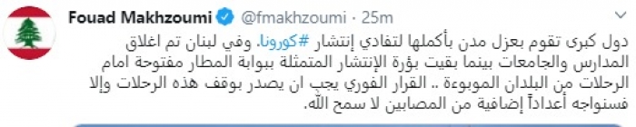 وقال في تغريدة عبر "تويتر" رصدها "المشهد العربي": "دول كبرى تقوم بعزل مدن بأكملها لتفادي انتشار كورونا. وفي لبنان تم اغلاق المدارس والجامعات بينما بقيت بؤرة الانتشار المتمثلة ببوابة المطار مفتوحة امام الرحلات من البلدان الموبوءة".