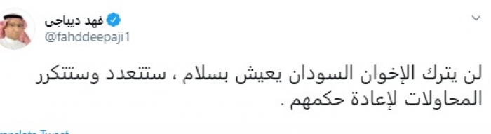 وقال في تغريدة عبر "تويتر" رصدها "المشهد العربي": "لن يترك الإخوان السودان يعيش بسلام ، ستتعدد وستتكرر المحاولات لإعادة حكمهم".