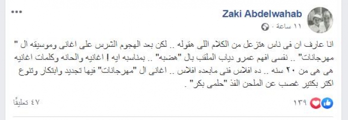وكتب "عبدالوهاب"، عبر حسابه الرسمي بموقع فيسبوك: "أنا عارف إن فيه ناس هتزعل من الكلام اللي هقوله، لكن بعد الهجوم الشرس على أغاني وموسيقى المهرجانات.. نفسي أفهم عمرو دياب الملقب بالهضبة.. بمناسبة إيه".