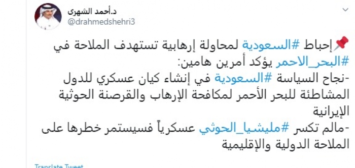 وقال في تغريدة عبر "تويتر" رصدها "المشهد العربي": "إحباط السعودية لمحاولة إرهابية تستهدف الملاحة في البحر الأحمر يؤكد أمرين هامين: نجاح السياسة السعودية في إنشاء كيان عسكري للدول المشاطئة للبحر الأحمر لمكافحة الإرهاب والقرصنة الحوثية الإيرانية ما لم تكسر مليشيا الحوثي عسكرياً فسيستمر خطرها على الملاحة الدولية والإقليمية".