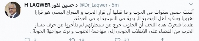 وكتب في تغريدة عبر "تويتر" رصدها "المشهد العربي": "أثبتت خمس سنوات من الحرب وما قبلها أن قرار الحرب والصراع اليمني هو قرارًا نخبويًا يحتكره أهل الهضبة الزيدية في الشرعية أو في الحوثة".