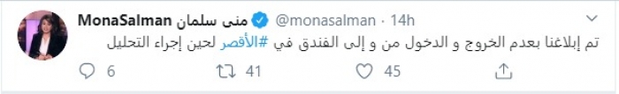 ومن جانبها، كتبت الإعلامية منى سلمان، مقدمة حفل افتتاح المهرجان، عبر حسابها على تويتر: "تم إبلاغنا بعدم الخروج والدخول من وإلى الفندق في الأقصر لحين إجراء التحليل".