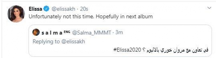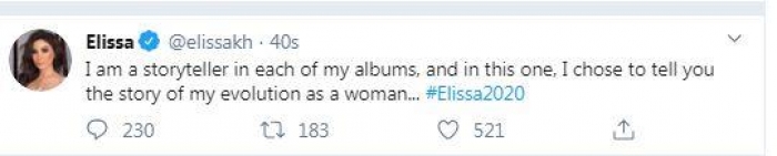 أما عن ألبومها الجديد لعام 2020، أجابت إليسا في عدة تغريدات لها عبر حسابها الرسمي بموقع "تويتر" على أسئلة عدد من جمهورها، وقالت: "أنا كاتبة قصص في كل من ألبوماتي، وفي هذا الألبوم، اخترت أن أخبركم بقصة تطوري كامرأة".