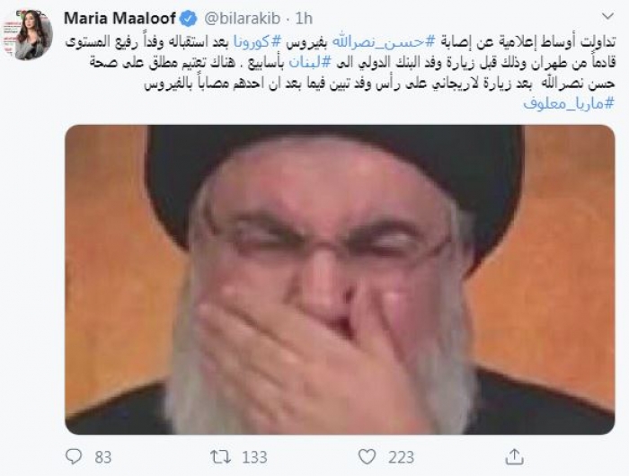 وقالت في تغريدة عبر "تويتر" رصدها "المشهد العربي": "تداولت أوساط إعلامية عن إصابة حسن نصرالله بفيروس كورونا بعد استقباله وفداً رفيع المستوى قادماً من طهران وذلك قبل زيارة وفد البنك الدولي إلى لبنان بأسابيع".