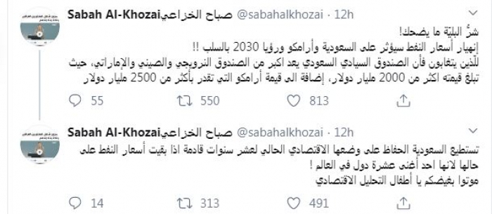 وكتب في تغريدات عبر "تويتر" رصدها "المشهد العربي": "شرُّ البليّة ما يضحك! انهيار أسعار النفط سيؤثر على السعودية وأرامكو ورؤيا 2030 بالسلب للّذين يتغابون فأن الصندوق السيادي السعودي يعد اكبر من الصندوق النرويجي والصيني والإماراتي، حيث تبلغ قيمته أكثر من 2000 مليار دولار، إضافة الى قيمة أرامكو التي تقدر بأكثر من 2500 مليار دولار".