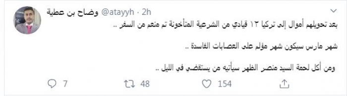 وقال في تغريدة عبر "تويتر" رصدها "المشهد العربي": "بعد تحويلهم أموال إلى تركيا 12 قيادي من الشرعية المتأخونة تم منعم من السفر".