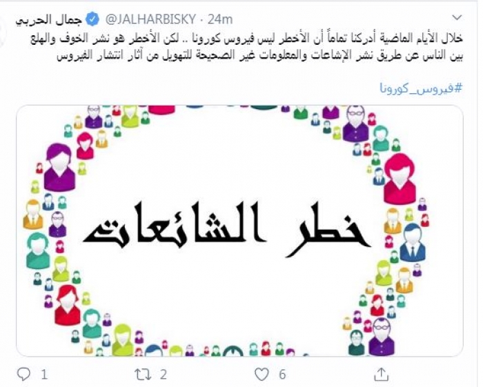 وقال في تغريدة عبر "تويتر" رصدها "المشهد العربي": "خلال الأيام الماضية أدركنا تماماً أن الأخطر ليس فيروس كورونا.. لكن الأخطر هو نشر الخوف والهلع بين الناس عن طريق نشر الإشاعات والمعلومات غير الصحيحة للتهويل من آثار انتشار الفيروس".