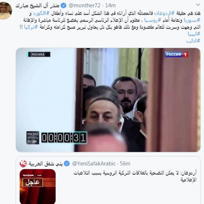 وقال في تغريدة عبر "تويتر" رصدها "المشهد العربي": "هذه هي حقيقة أردوغان فالحمدلله الذي أراناه في هذا الشكل أسد على نساء وأطفال الكورد وسوريا ونعامة أمام روسيا، معلوم أن الإعلام الرئاسي الرسمي يخضع للرئاسة مباشرة والإهانة التي وجهت وسربت للعالم مقصودة ومع ذلك هاهو بكل ذل يحاول تبرير مسح كرامته وكرامة تركيا".