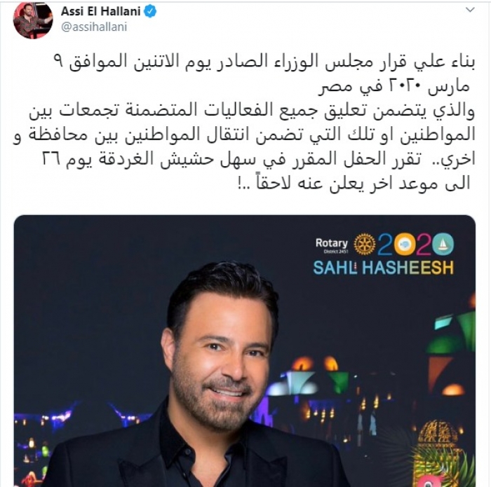 وكتب "حلاني" تغريدة، عبر حسابه الرسمي بموقع "تويتر": " بناء علي قرار مجلس الوزراء الصادر يوم الاتنين الموافق ٩ مارس ٢٠٢٠ في مصر، والذي يتضمن تعليق جميع الفعاليات المتضمنة تجمعات بين المواطنين أو تلك التي تضمن انتقال المواطنين بين محافظة و اخري.. تقرر الحفل المقرر في سهل حشيش الغردقة يوم ٢٦ الى موعد اخر يعلن عنه لاحقاً".