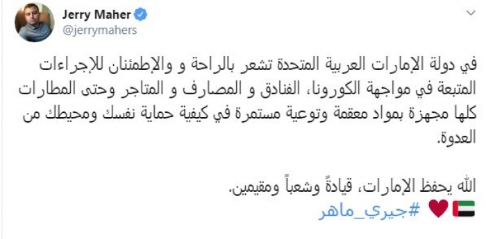 جيري ماهر يُشيد بإجراءات الإمارات ضد كورونا