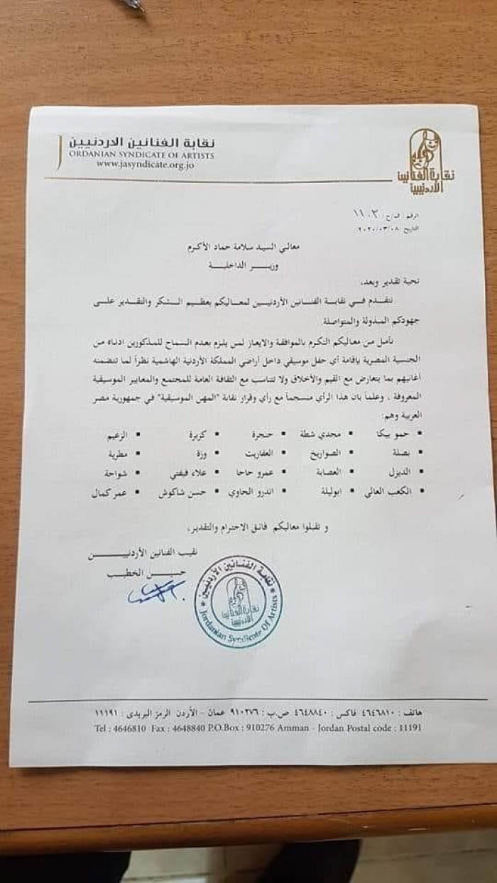 أعلنت نقابة الفنانين الأردنيين، بقيادة حسين الخطيب، عن تقدمها بطلب إلى وزير الداخلية الأردني؛ لمنع إقامة أي حفل موسيقي لـ20 من مطربي وفرق المهرجانات، وفي مقدمتهم حسن شاكوش، وحمو بيكا، وعمر كمال.