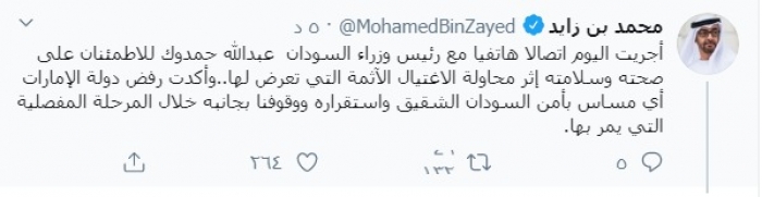 وكتب بن زايد عبر تغريدة له على "تويتر" رصدها "المشهد العربي":"أجريت اليوم اتصالا هاتفيا مع رئيس وزراء السودان عبدالله حمدوك للاطمئنان على صحته وسلامته إثر محاولة الاغتيال الآثمة التي تعرض لها.