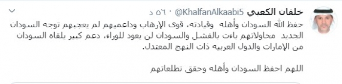 وكتب الكعبي عبر تغريدة له على "تويتر" رصدها "المشهد العربي":"حفظ الله السودان وأهله وقيادته، قوى الإرهاب وداعميهم لم يعجبهم توجه السودان الجديد محاولاتهم باءت بالفشل والسودان لن يعود للوراء".