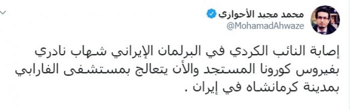 وكتب الصحفي محمد مجيد الأحوازي عبر تغريدة له على "تويتر" رصدها "المشهد العربي":"إصابة النائب الكردي في البرلمان الإيراني شهاب نادري بفيروس كورونا المستجد".