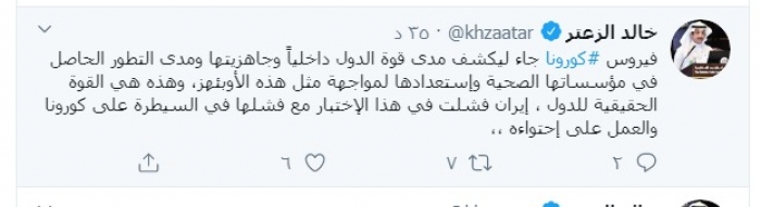 وكتب الزعتر عبر تغريدة له على "تويتر" رصدها "المشهد العربي":"فيروس كورونا جاء ليكشف مدى قوة الدول داخلياً وجاهزيتها ومدى التطور الحاصل في مؤسساتها الصحية واستعدادها لمواجهة مثل هذه الأوبئة، وهذه هي القوة الحقيقية للدول".