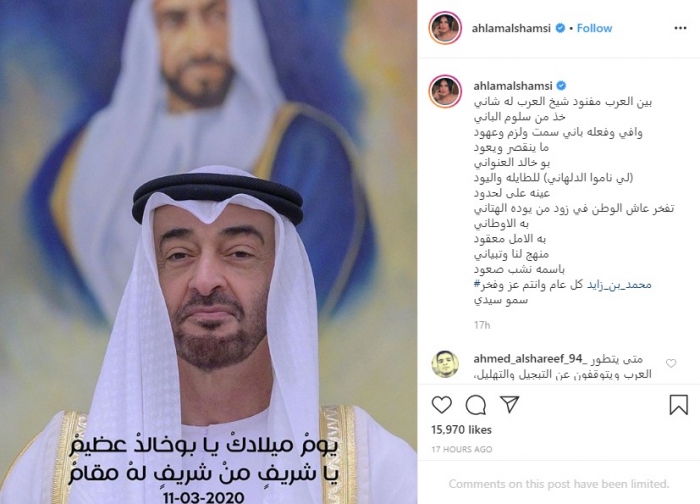 هنأت الفنانة الإماراتية أحلام، عبر حسابها الرسمي بموقع "انستجرام"، الشيخ محمد بن زايد آل نهيان، ولي عهد أبو ظبي، بعيد ميلاده.