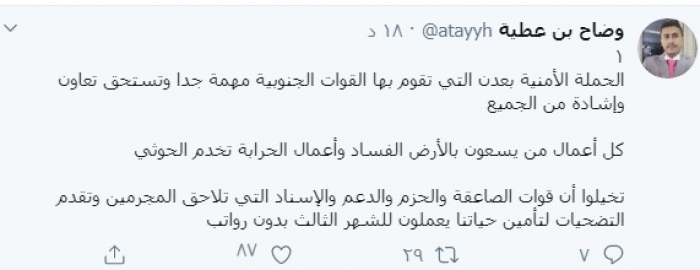 وكتب بن عطية عبر تغريدة له على "تويتر" رصدها "المشهد العربي":"الحملة الأمنية بعدن التي تقوم بها القوات الجنوبية مهمة جدا وتستحق تعاون وإشادة من الجميع".