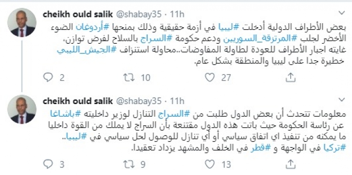 وقال في تغريدات عبر "تويتر" رصدها "المشهد العربي": "معلومات تتحدث أن بعض الدول طلبت من السراج التنازل لوزير داخليته باشاغا عن رئاسة الحكومة حيث باتت هذه الدول مقتنعة بأن السراج لا يملك من القوة داخليا ما يمكنه من تنفيذ اي اتفاق سياسي أو أي تنازل للوصول لحل سياسي في ليبيا.. تركيا في الواجهة وقطر في الخلف والمشهد يزداد تعقيدا".