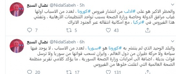 وأضاف: "والخطر الأكبر هو على إدلب من انتشار فيروس كورونا، لعدد من الأسباب أولها غياب مرافق الدولة وخاصة وزارة الصحة بسبب تواجد التنظيمات الإرهابية، وتفشي هذا الفيروس في تركيا، مع إمكانية انتقاله عبر الجنود الأتراك".