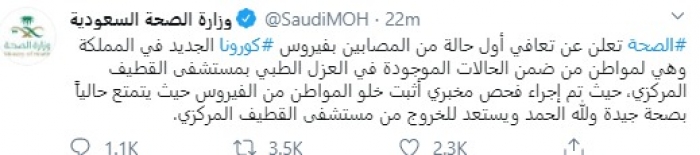 أعلنت وزارة الصحة السعودية، اليوم، عن تعافي أول حالة من المصابين بفيروس كورونا الجديد في المملكة العربية السعودية.