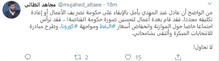 وكتب في تغريدة عبر "تويتر" رصدها "المشهد العربي": "من الواضح أن عادل عبد المهدي يأمل بالإبقاء على حكومة تصريف الأعمال أو إعادة تكليفه مجددًا، فقد قام بعدة أعمال لتحسين صورة حكومة القناصة".