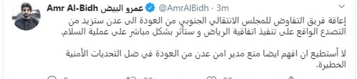 أدان عضو هيئة رئاسة المجلس الانتقالي الجنوبي عمرو البيض، إعاقة فريق التفاوض للمجلس الانتقالي الجنوبي من العودة للعاصمة عدن، مؤكدًا أن ذلك سيزيد من التصدع الواقع على تنفيذ اتفاق الرياض وسيؤثر بشكل مباشر على عملية السلام.