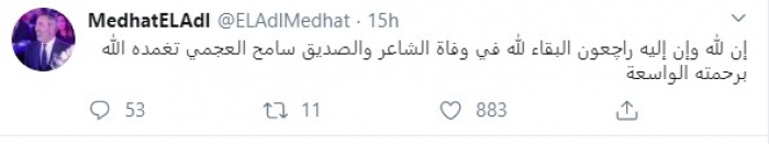 نشر السيناريست مدحت العدل، عبر حسابه الشخصي بموقع "تويتر"، تغريدة ينعى بها الشاعر والمنتج سامح العجمي.