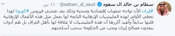 وكتب آل سعود عبر تغريدة له على "تويتر" رصدها "المشهد العربي":"إيران الآن تواجه صعوبات اقتصادية وصحية وذلك بعد تفشي فيروس كورونا لهذا تعطي الأوامر لهذه المليشيات الإرهابية التابعة لها بعمل مثل هذه الأعمال الإرهابية".