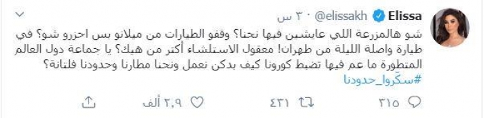نشرت النجمة اللبنانية إليسا عبر حسابها الشخصي بموقع "تويتر"، تغريدة تعلق بها على فتح الحدود اللبنانية، واستمرار الطيران اللبناني من وإلى الدول المصابة بفيروس كورونا.